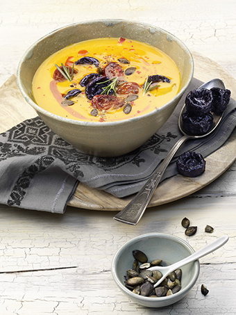 - Frullare la zucca. Aggiustare di sale e pepe, aggiungere le prugne e tenere al caldo. Far saltare la salsiccia piccante in padella per 5 minuti, su ciascun lato, a fuoco medio. Spezzettare il rosmarino e spargerlo sulla salsiccia.